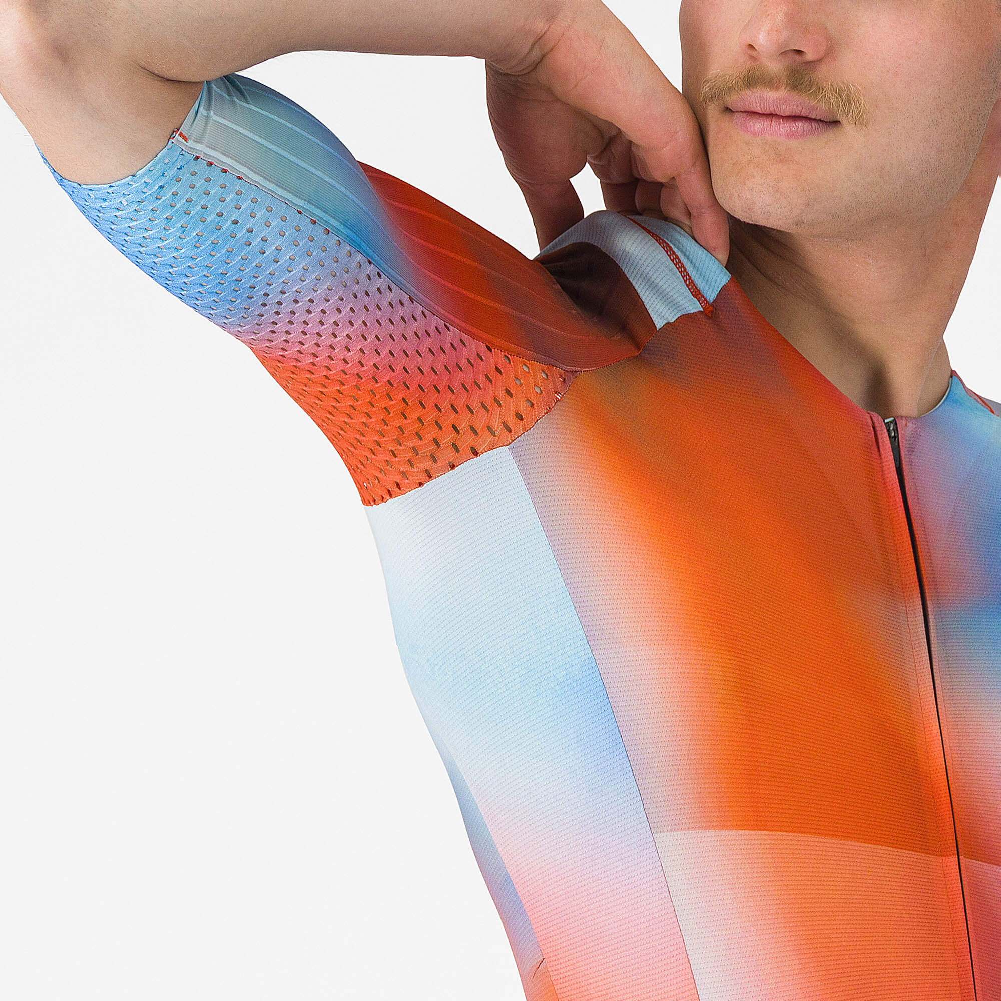 - Ribbed sleeve and shoulder fabric delivers Coefficient of Drag (CdA) savings