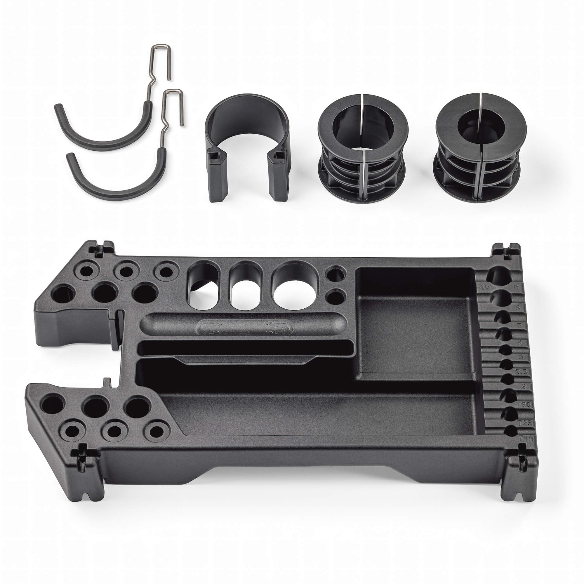It is moulded, with dedicated spaces for your T-Handle wrenches, pliers and thru-axle and recesses for fluid bottles, components, extra tools and your smart phone. A magnetic parts tray keeps track of loose nuts and bolts, while accessory hooks let you hang wheels, handlebars and forks until required.